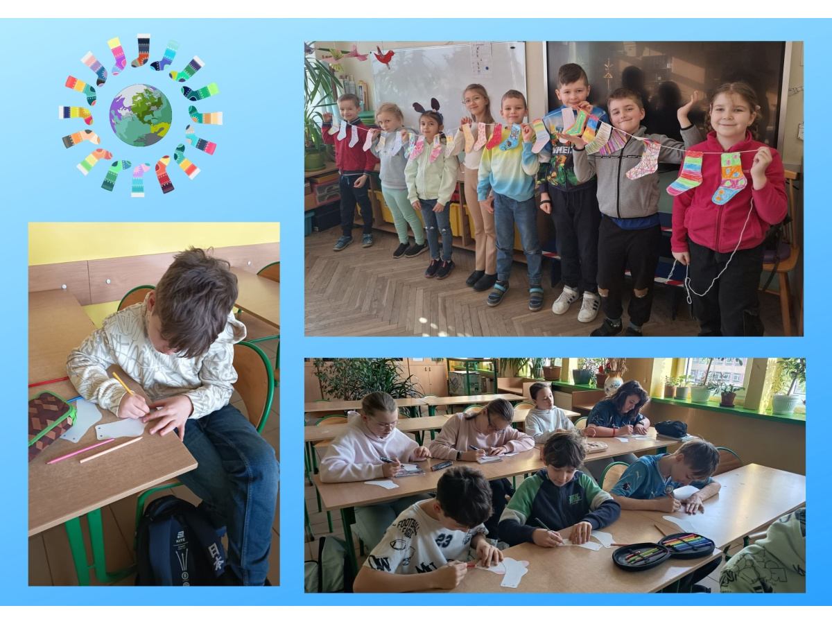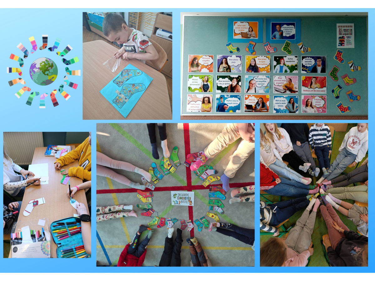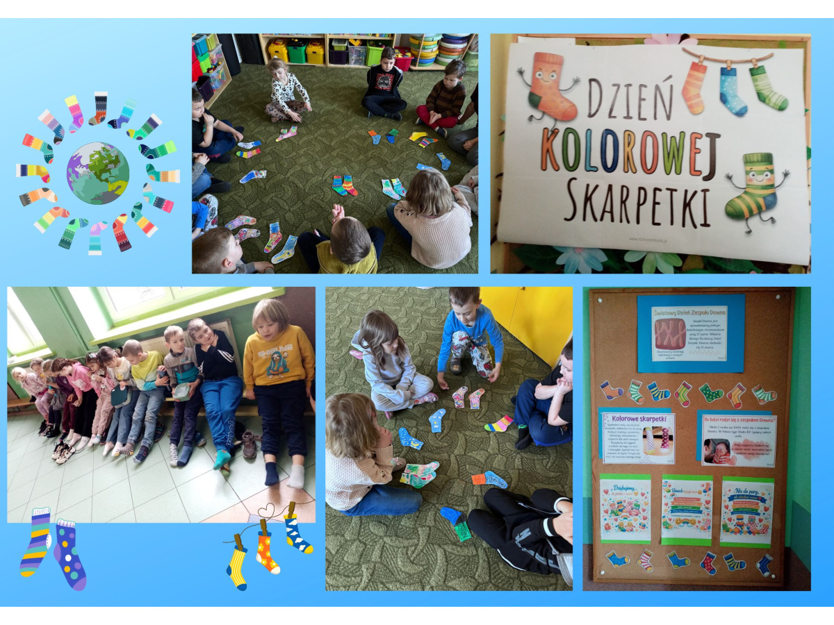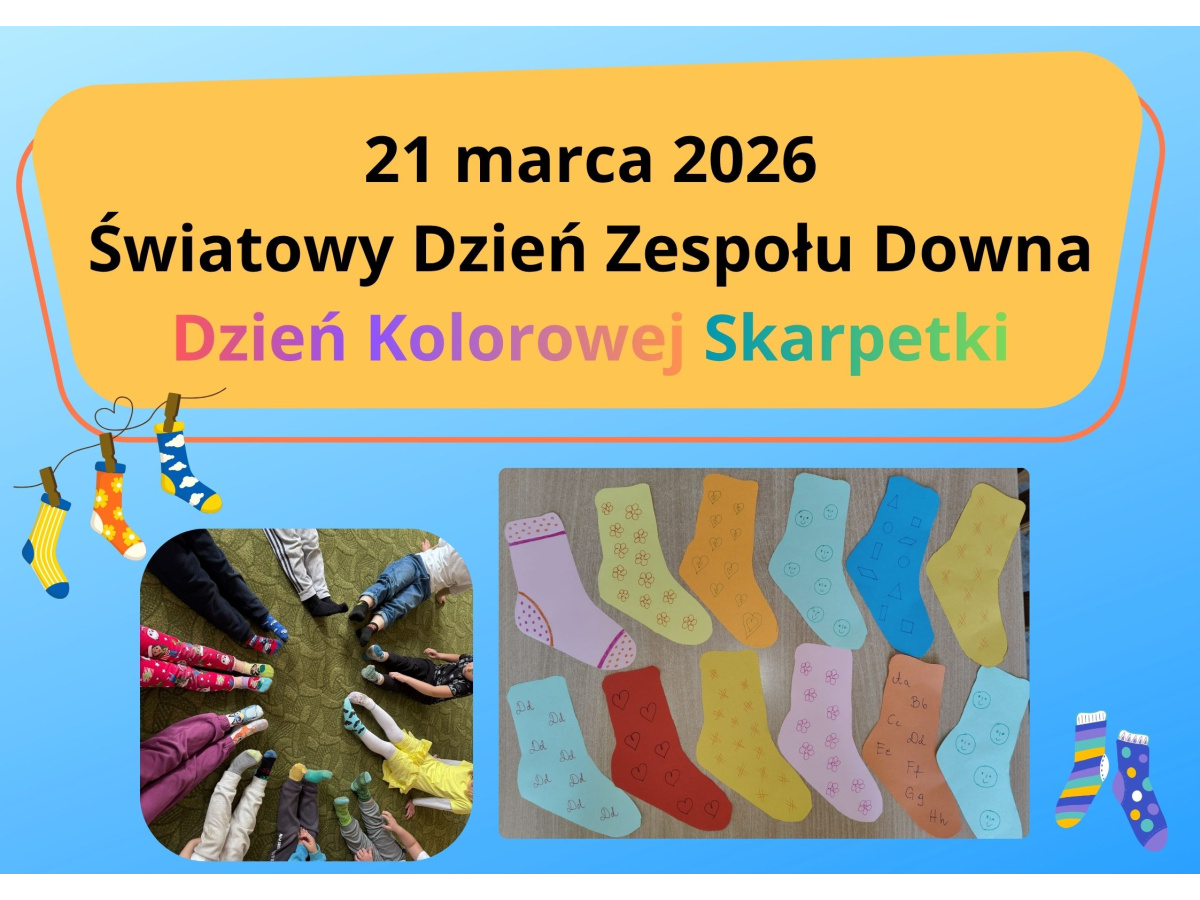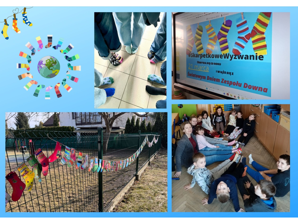 Uczniowie naszej szkoły i dzieci z przedszkola wzięły udział w zajęciach dotyczących zespołu Downa oraz przygotowały kolorowe skarpetki, które zostały rozwieszone w szkole i na planu zabaw. 23 marca uczniowie i przedszkolaki założyli kolorowe skarpetki, nie do pary, które są symbolem Dnia osób z zespołem Downa.