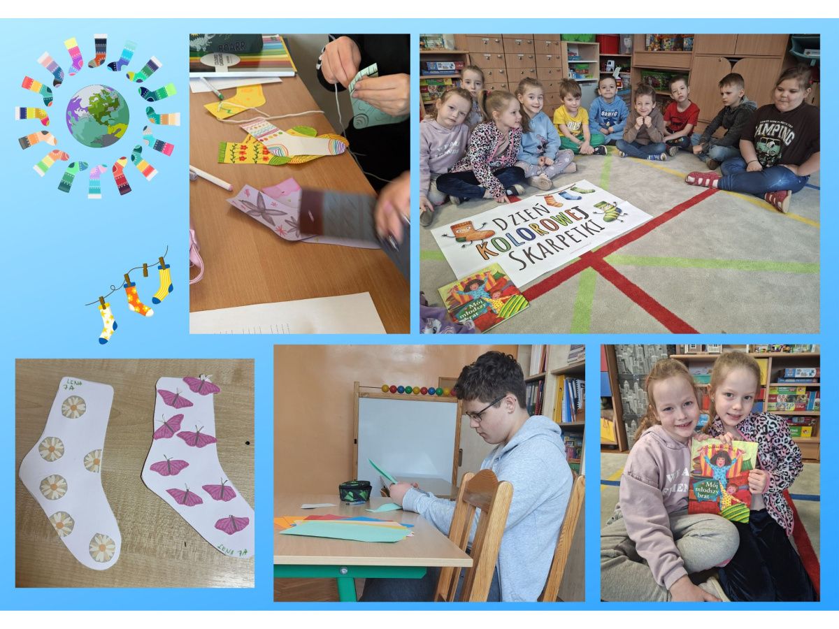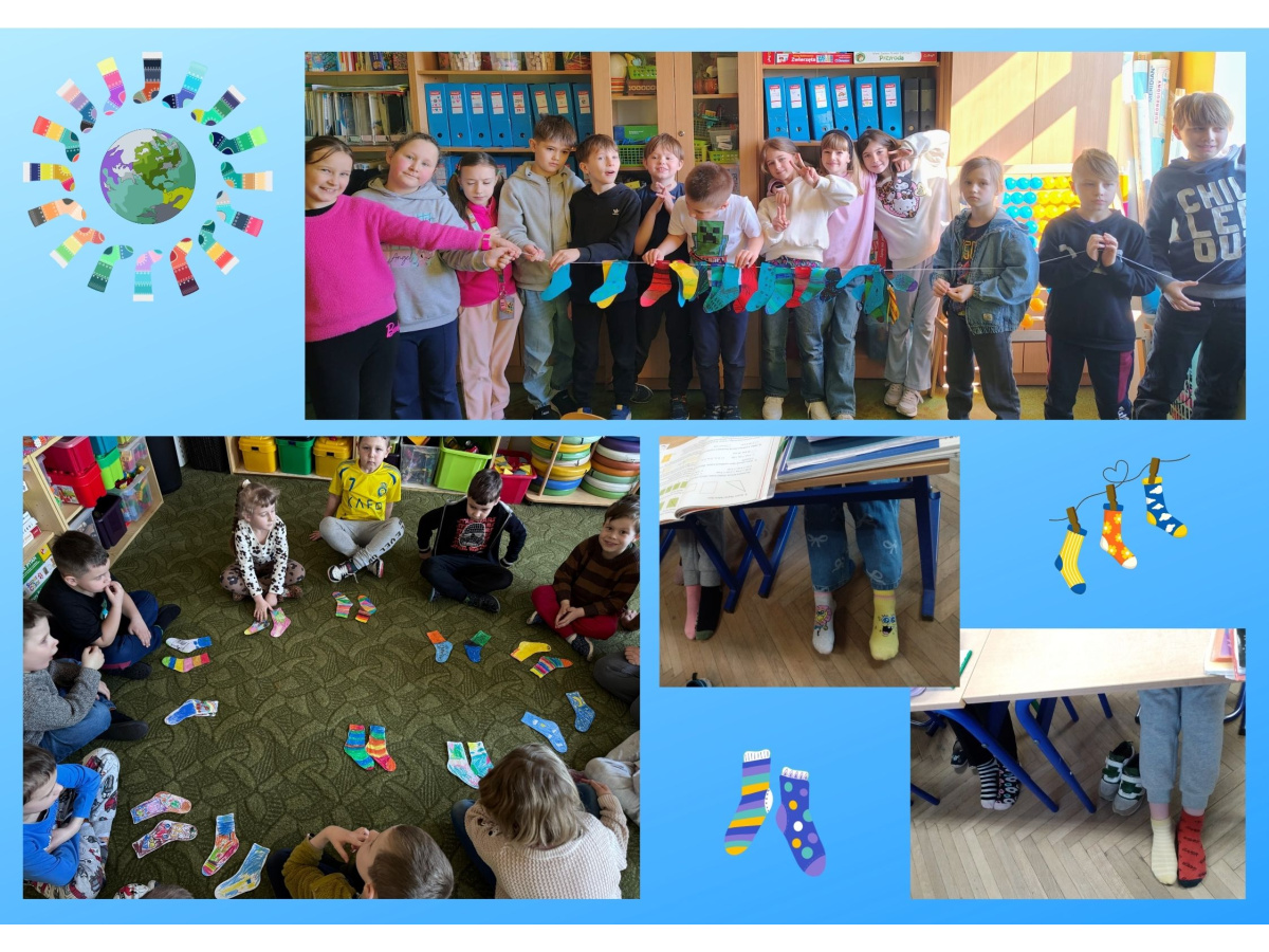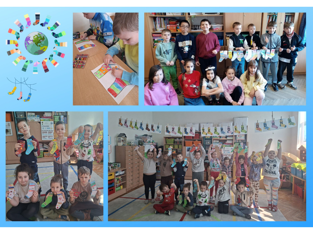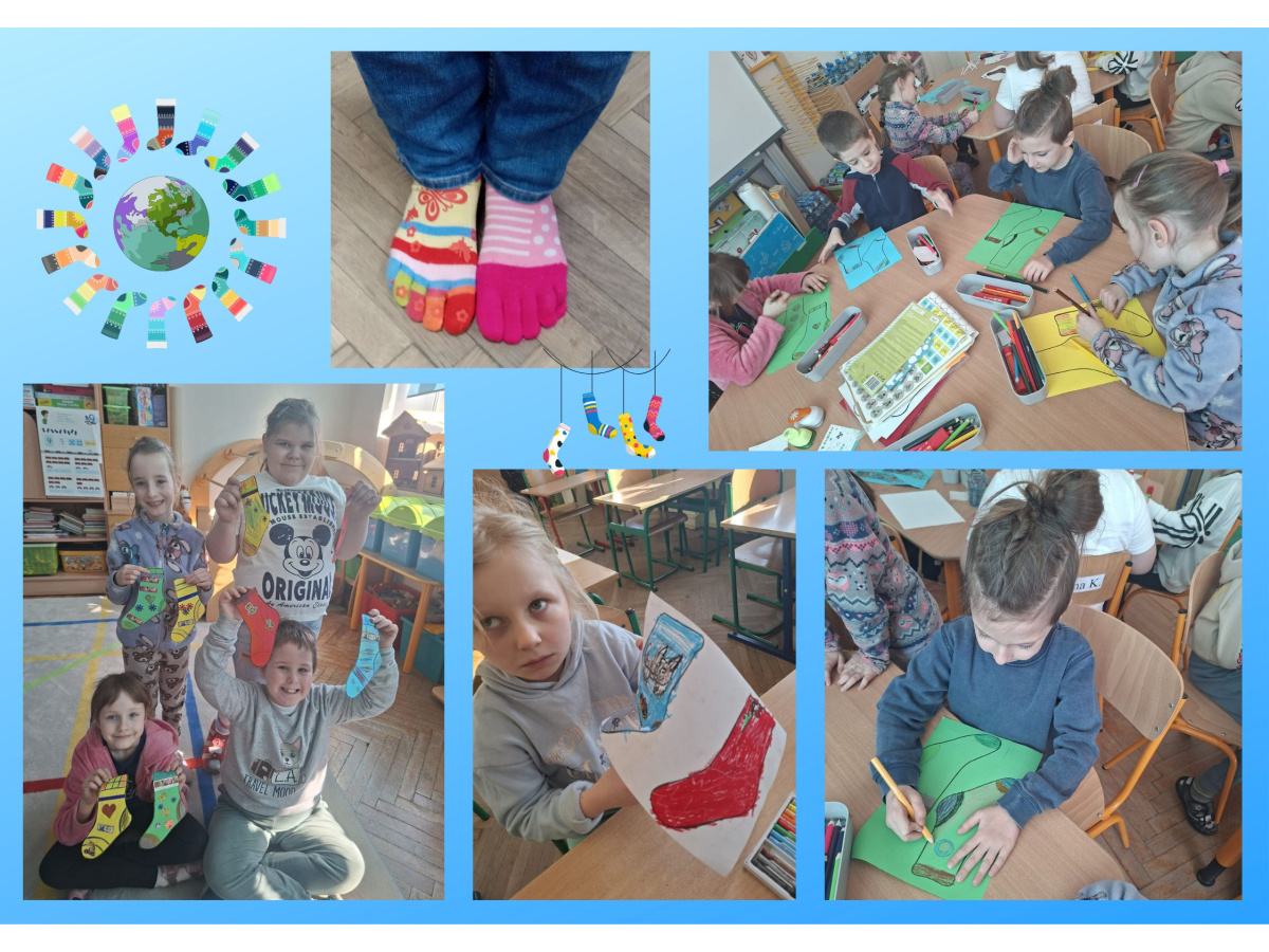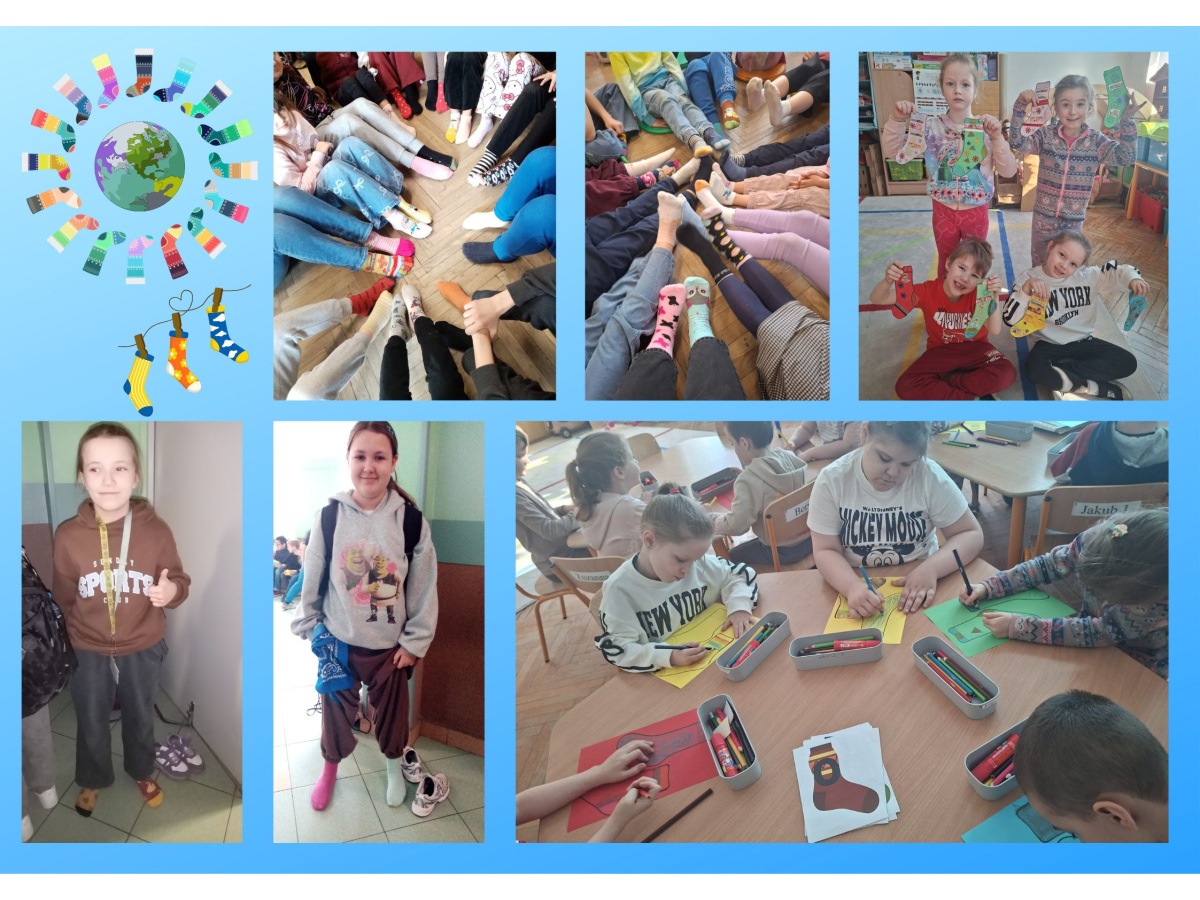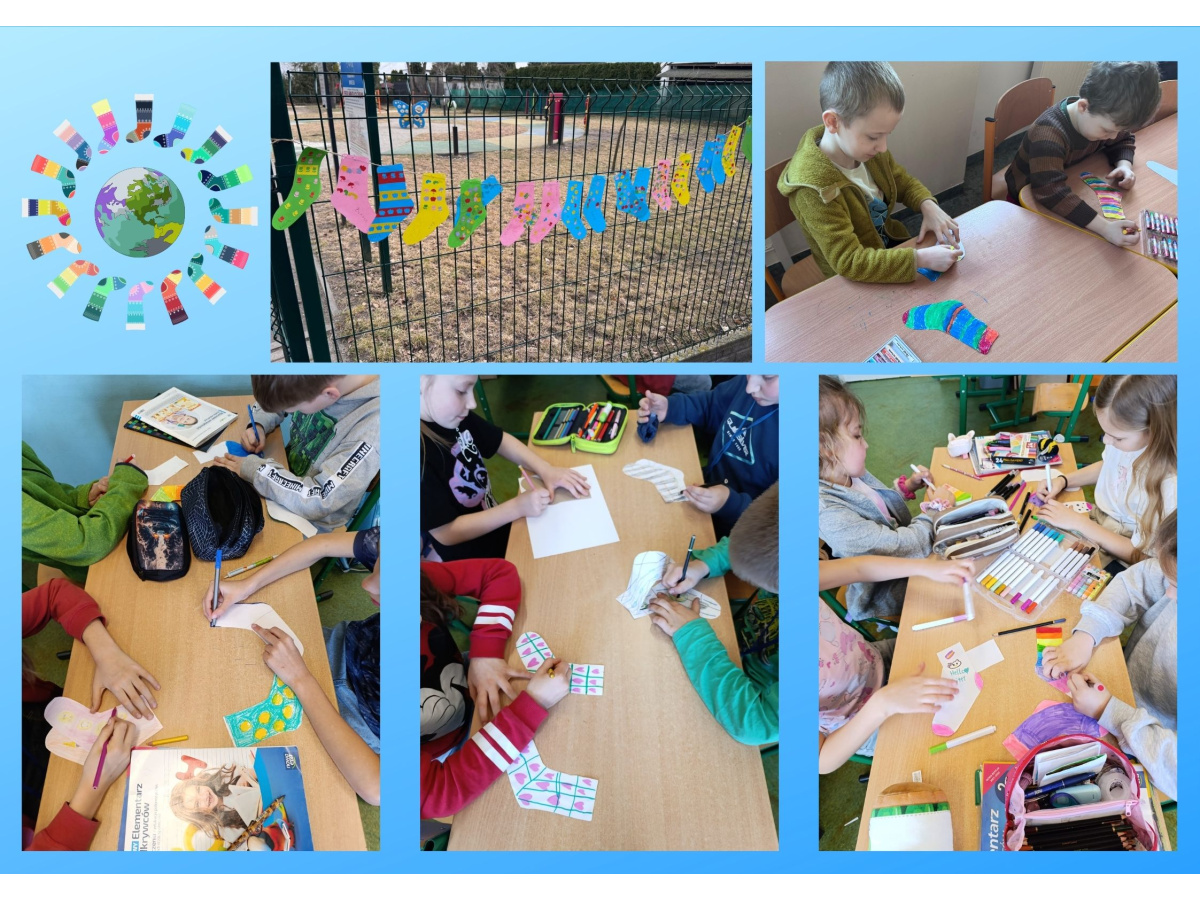 Uczniowie naszej szkoły i dzieci z przedszkola wzięły udział w zajęciach dotyczących zespołu Downa oraz przygotowały kolorowe skarpetki, które zostały rozwieszone w szkole i na planu zabaw. 23 marca uczniowie i przedszkolaki założyli kolorowe skarpetki, nie do pary, które są symbolem Dnia osób z zespołem Downa.