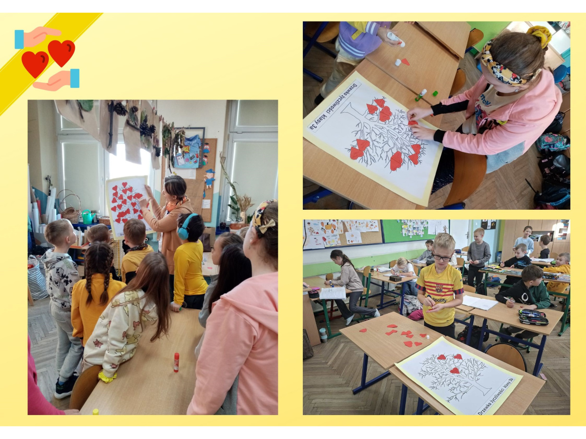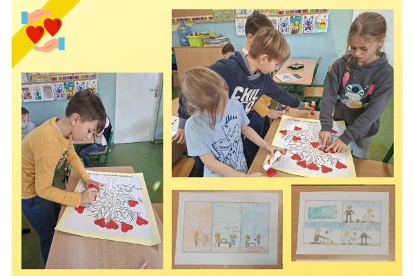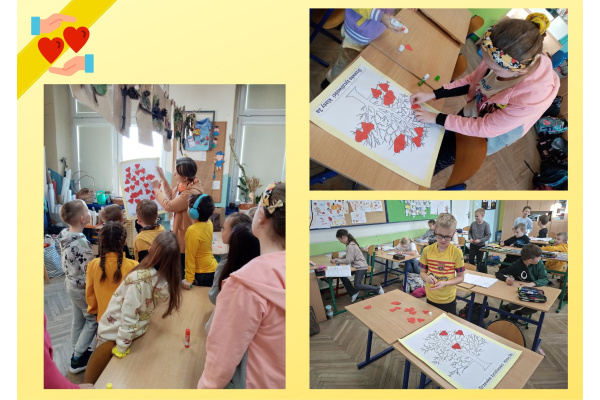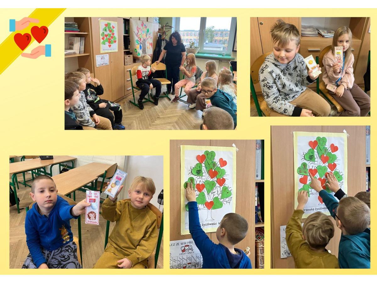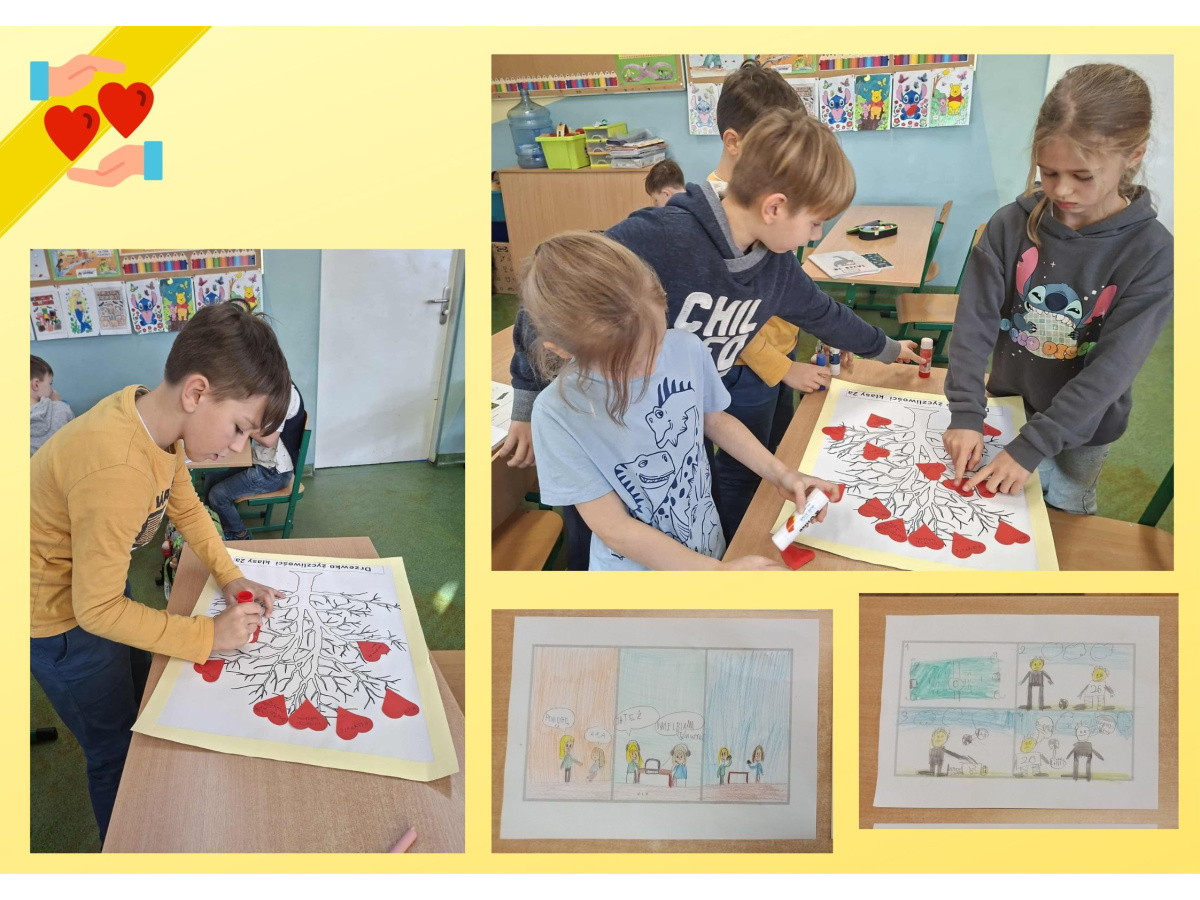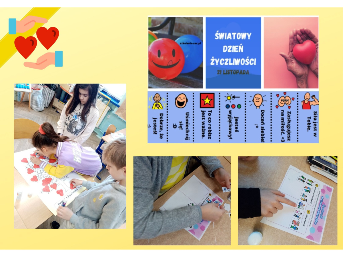 21 listopada uczniowie klas 1-3 świętowali Światowy Dzień Życzliwości. Każda klasa przez cały dzień skupiała się na zagadnieniu, jakim jest życzliwość wykonując różnorodne zadania. Uczniowie pracowali tego dnia głównie w grupie, małych zespołach i parach. Stworzyli „Kodeks dobrego kolegi” i „drzewko życzliwości”, na którym przyczepione zostały serduszka z propozycjami życzliwych słów i zachowań. Dzieci wczuły się w aktorów odgrywając scenki dramowe, a następnie określały czy dane zachowanie jest życzliwe dla drugiej osoby. Część klas tworzyła, podczas edukacji plastycznej, komiksy przedstawiające bohaterów wymyślonej historii, którzy przejawiają życzliwe zachowania. Tego dnia w każdej klasie królował kolor żółty, jako symbol otwartości i chęci szerzenia dobra.