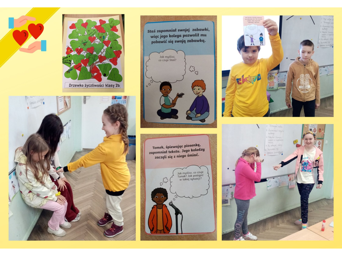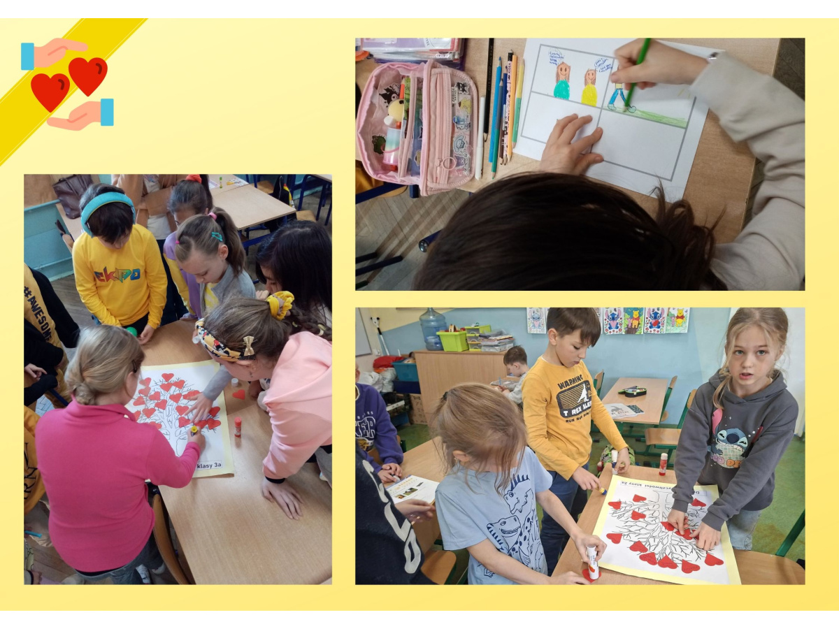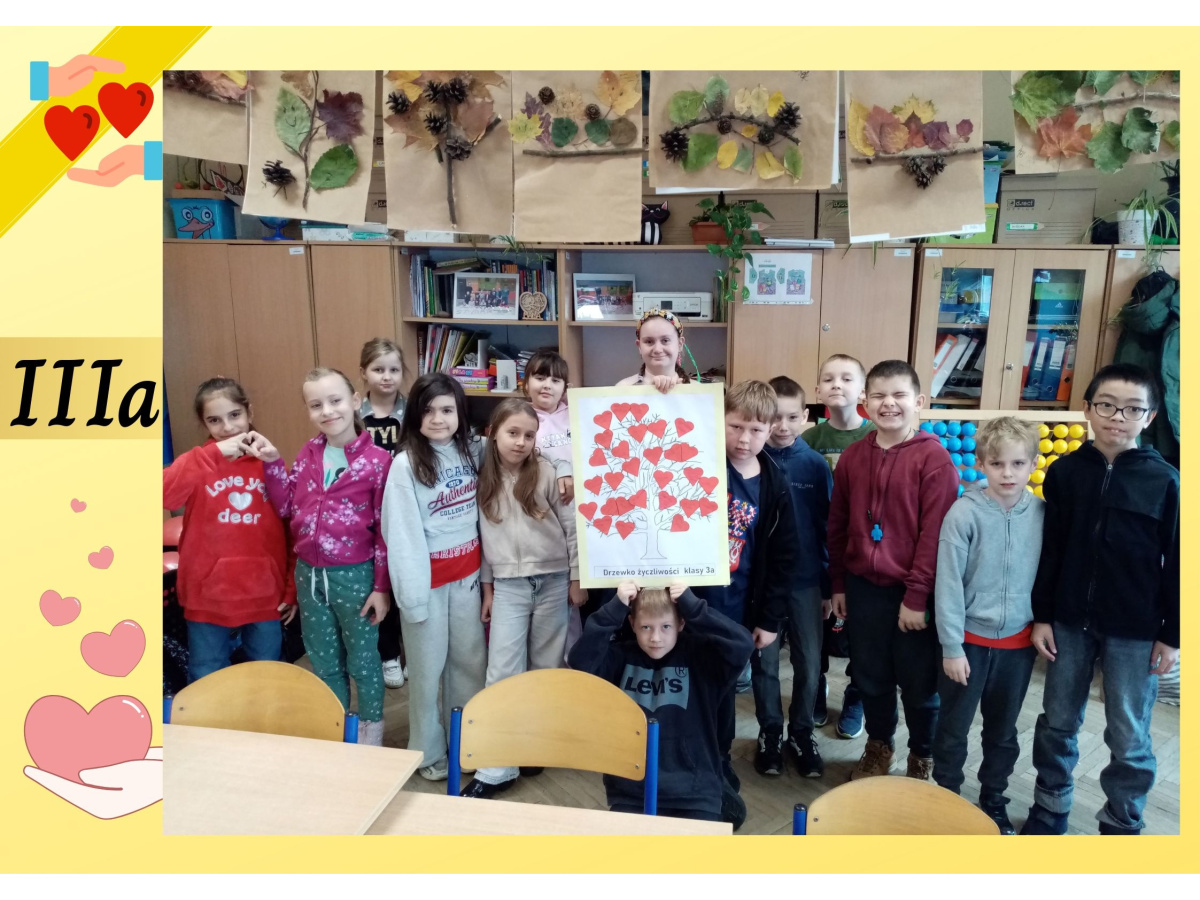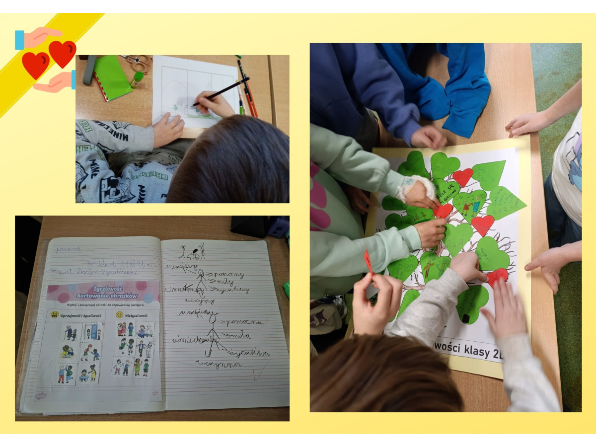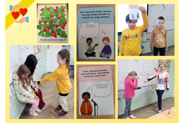 21 listopada uczniowie klas 1-3 świętowali Światowy Dzień Życzliwości. Każda klasa przez cały dzień skupiała się na zagadnieniu, jakim jest życzliwość wykonując różnorodne zadania. Uczniowie pracowali tego dnia głównie w grupie, małych zespołach i parach. Stworzyli „Kodeks dobrego kolegi” i „drzewko życzliwości”, na którym przyczepione zostały serduszka z propozycjami życzliwych słów i zachowań. Dzieci wczuły się w aktorów odgrywając scenki dramowe, a następnie określały czy dane zachowanie jest życzliwe dla drugiej osoby. Część klas tworzyła, podczas edukacji plastycznej, komiksy przedstawiające bohaterów wymyślonej historii, którzy przejawiają życzliwe zachowania. Tego dnia w każdej klasie królował kolor żółty, jako symbol otwartości i chęci szerzenia dobra.
