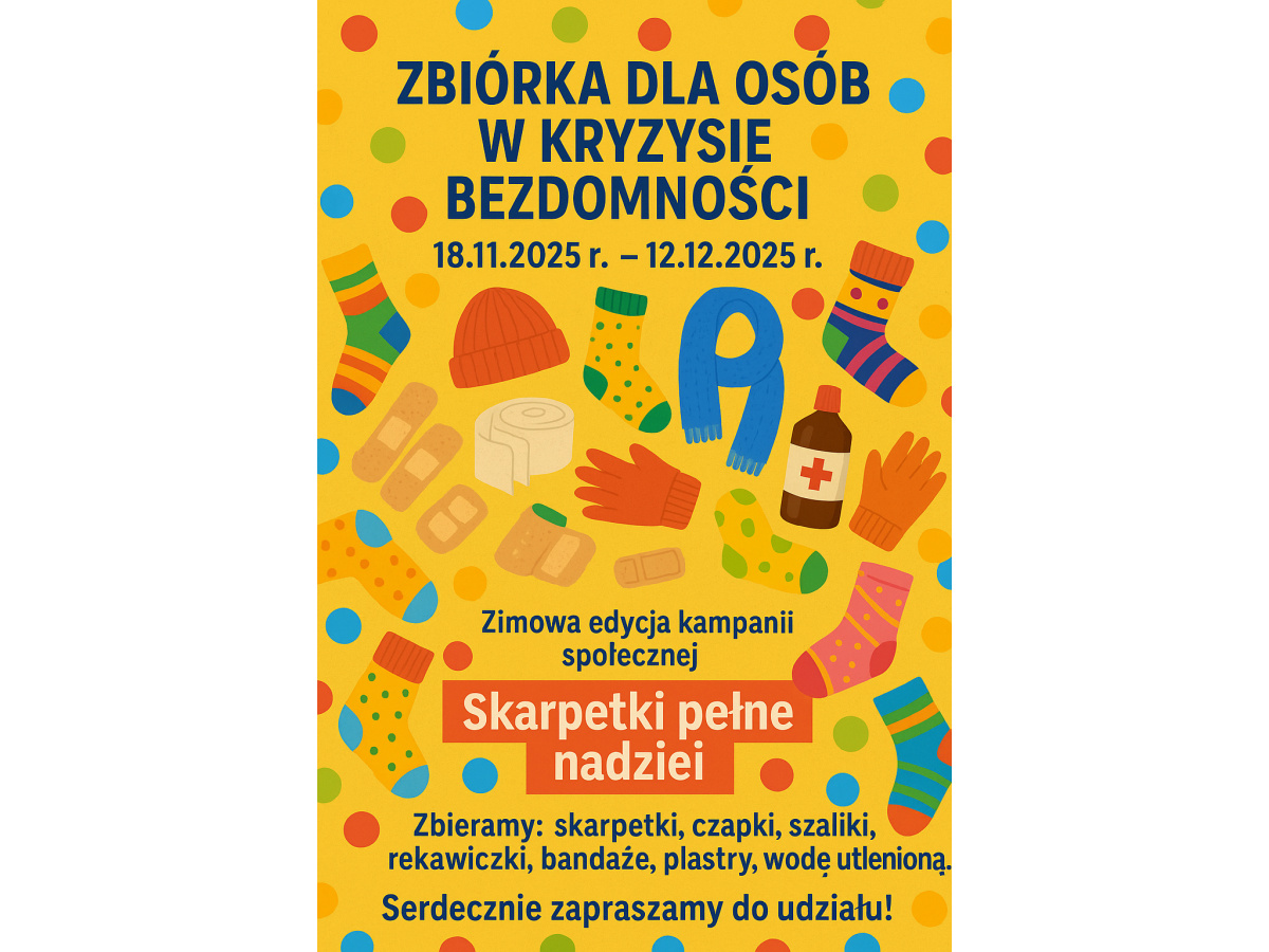 Zima to trudny czas dla osób w kryzysie bezdomności – czas chłodu, samotności i codziennej walki o przetrwanie. Dlatego zapraszamy całą społeczność szkolną do udziału w zimowej edycji kampanii społecznej „Skarpetki pełne nadziei”, która potrwa od 18 listopada do 12 grudnia 2025 roku.