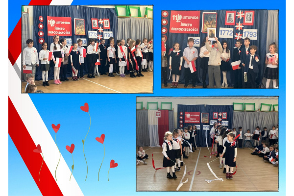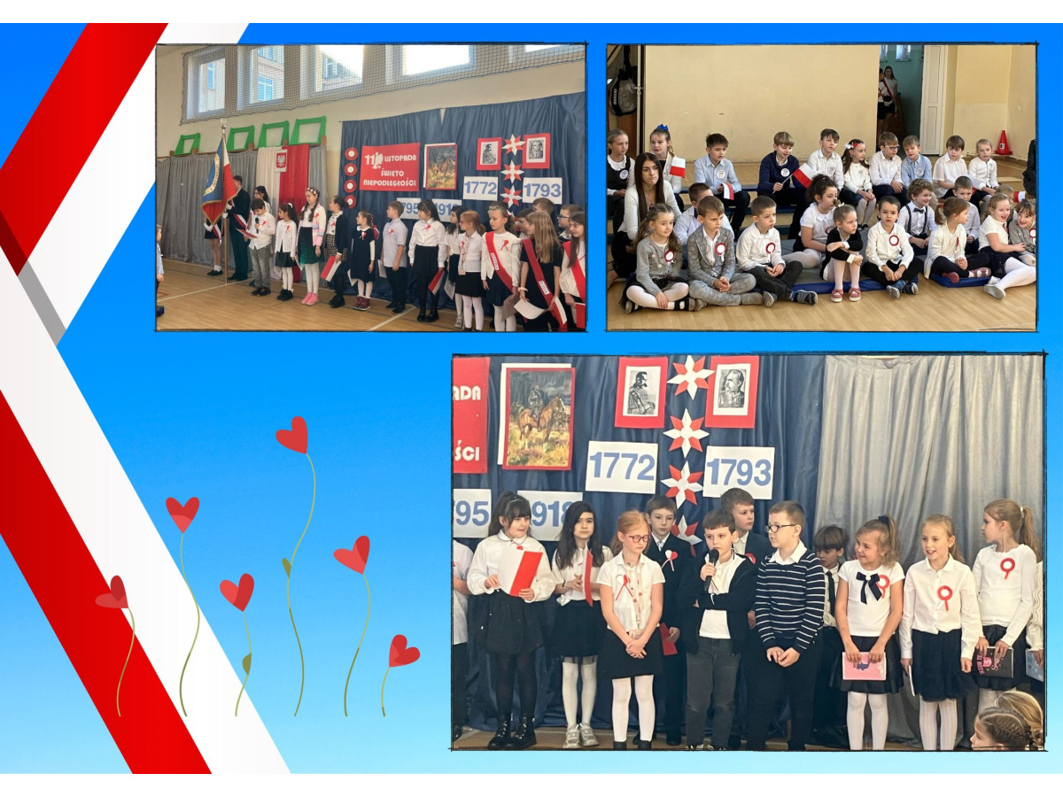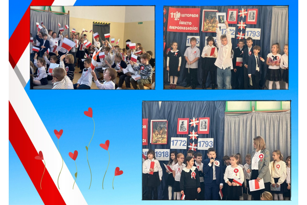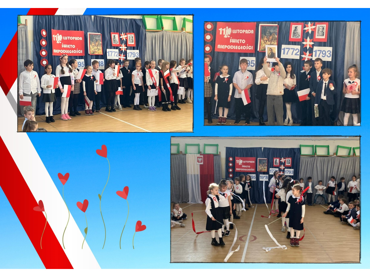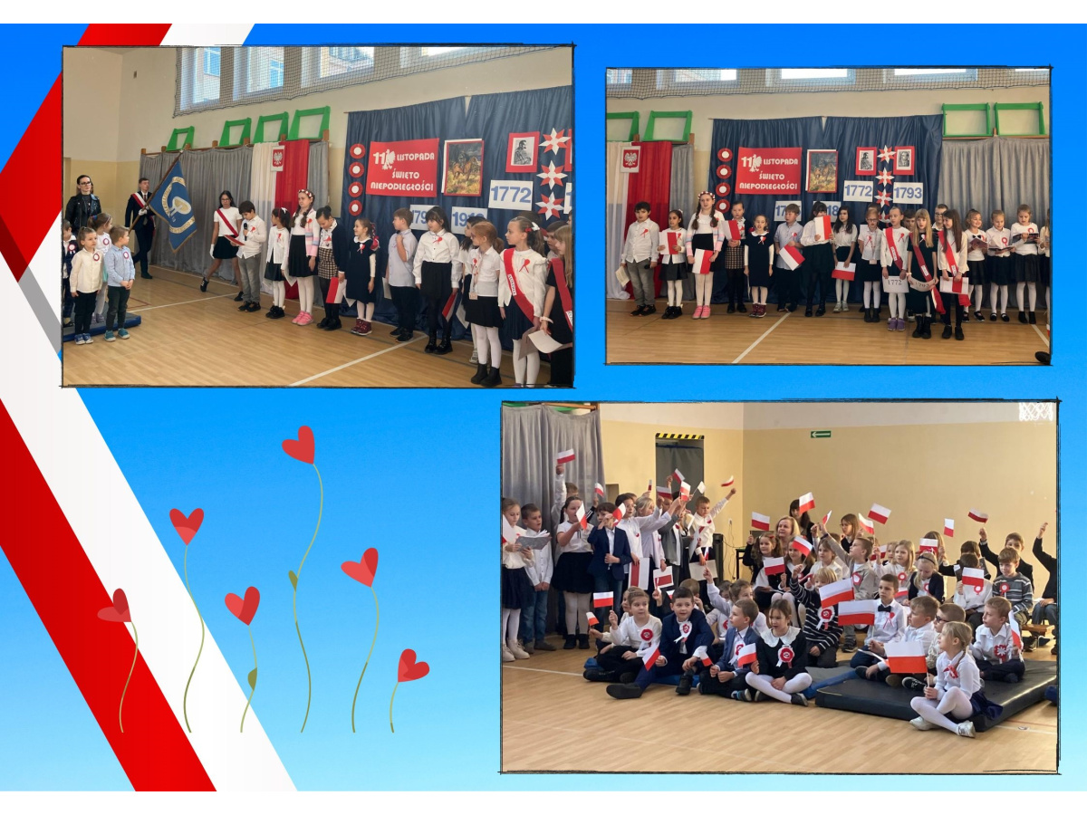 Z okazji Narodowego Święta Niepodległości uczniowie klas 1-3 wraz z wychowawcami przygotowali uroczysty apel. Zaproszono na niego dyrekcję szkoły, nauczycieli oraz grupy dzieci 6 letnich wraz z wychowawcami. Młodzi artyści zaprezentowali wiersze i pieśni o tematyce patriotycznej. Na koniec dziewczynki z klas: 3a i 2b zatańczyły układ taneczny z biało-czerwonymi szarfami. Gościnnie wystąpił także Maksymilian Krakowski, uczeń klasy 6a i zaśpiewał piosenkę "Taki kraj". Uroczystości towarzyszył podniosły i radosny nastrój. Z okazji zbliżającego się święta życzenia złożyła uczniom i nauczycielom dyrektor szkoły p. Renata Białecka. Wręczyła także nagrody i wyróżnienia za wykonanie plakatu związanego z obchodami Święta Niepodległości.