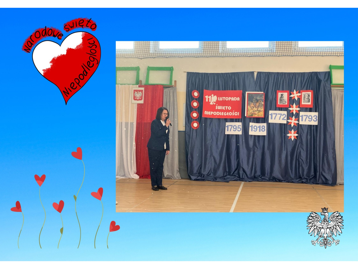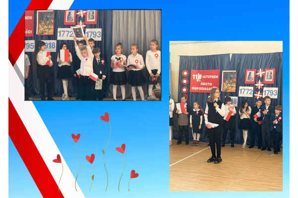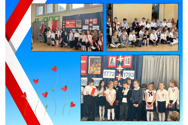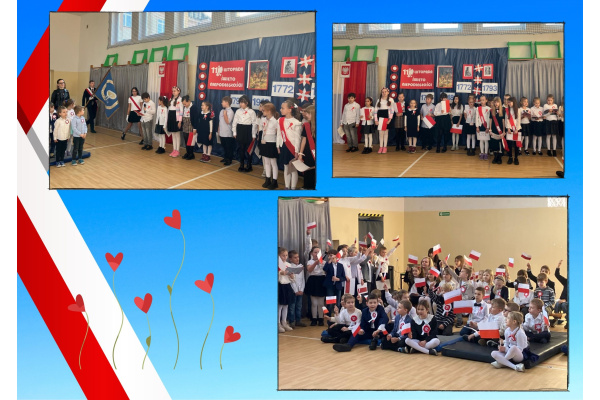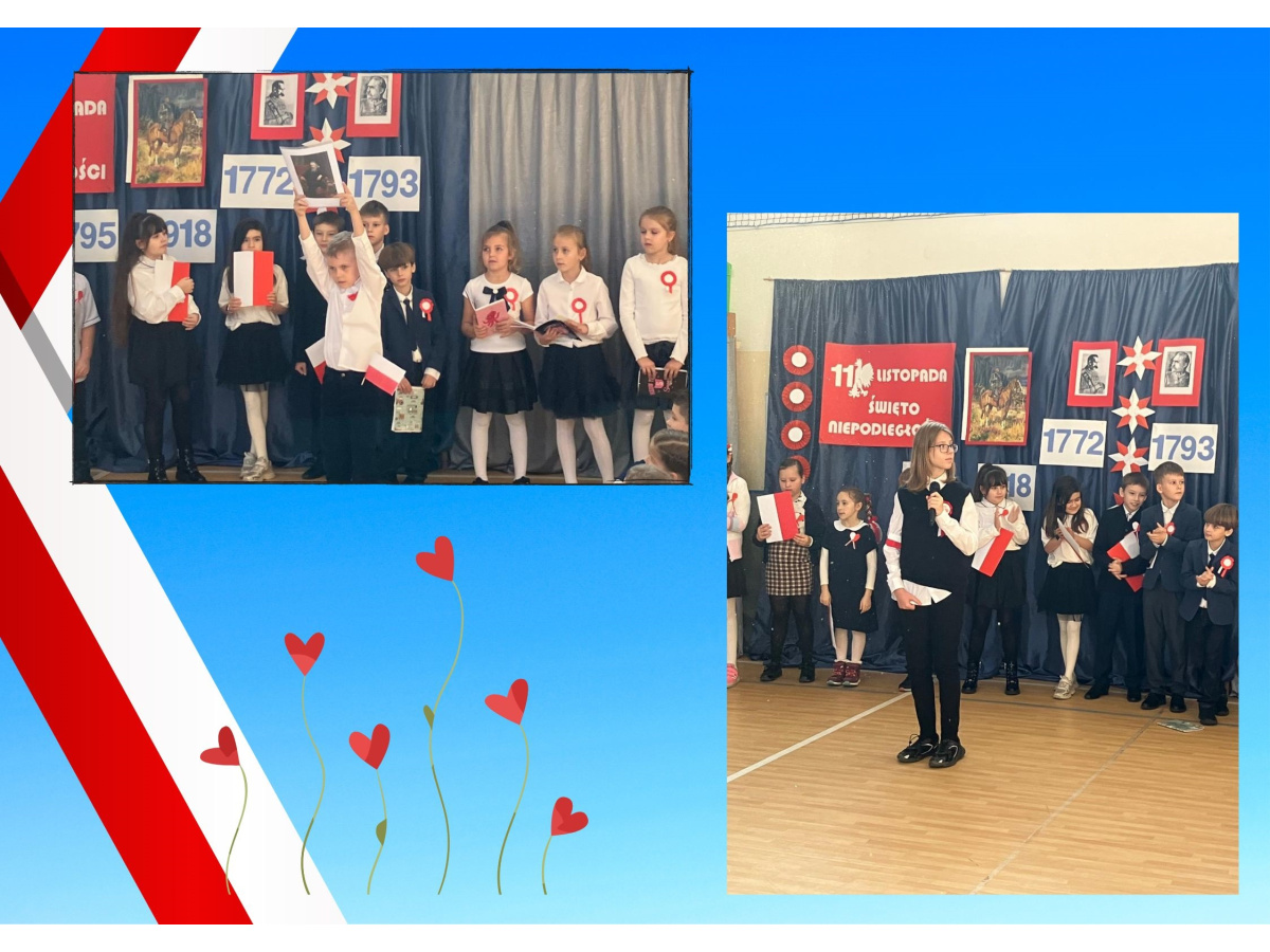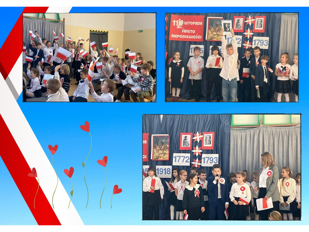 Z okazji Narodowego Święta Niepodległości uczniowie klas 1-3 wraz z wychowawcami przygotowali uroczysty apel. Zaproszono na niego dyrekcję szkoły, nauczycieli oraz grupy dzieci 6 letnich wraz z wychowawcami. Młodzi artyści zaprezentowali wiersze i pieśni o tematyce patriotycznej. Na koniec dziewczynki z klas: 3a i 2b zatańczyły układ taneczny z biało-czerwonymi szarfami. Gościnnie wystąpił także Maksymilian Krakowski, uczeń klasy 6a i zaśpiewał piosenkę "Taki kraj". Uroczystości towarzyszył podniosły i radosny nastrój. Z okazji zbliżającego się święta życzenia złożyła uczniom i nauczycielom dyrektor szkoły p. Renata Białecka. Wręczyła także nagrody i wyróżnienia za wykonanie plakatu związanego z obchodami Święta Niepodległości.
