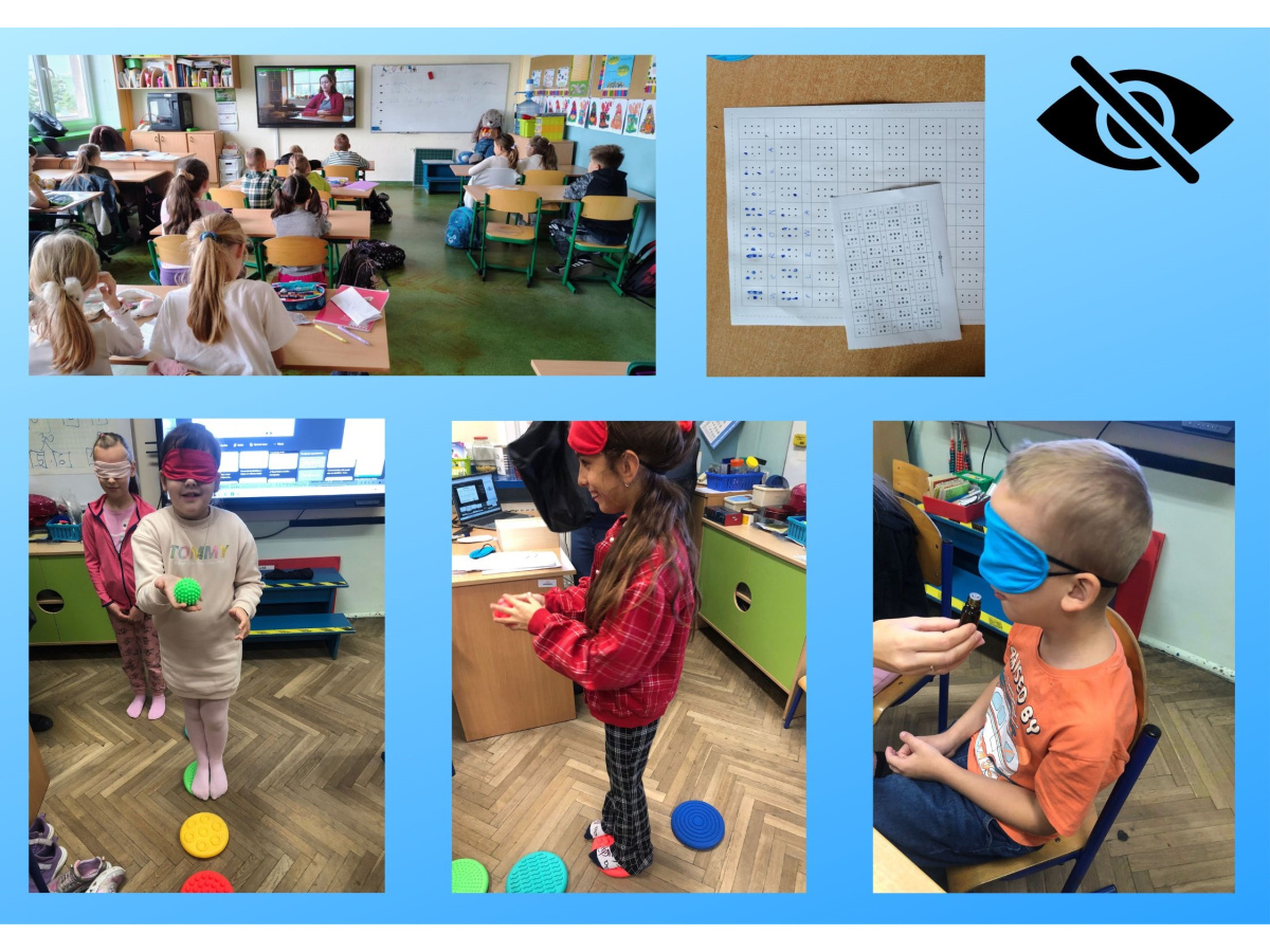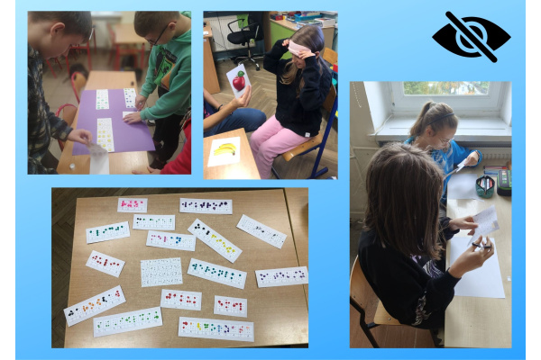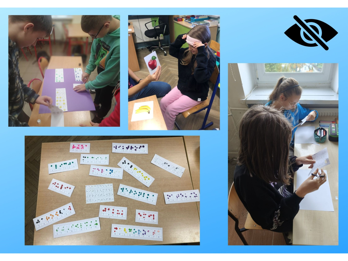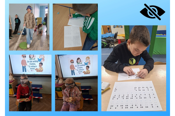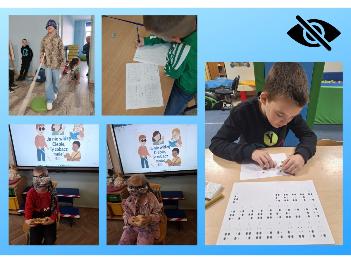 W październiku obchodziliśmy Międzynarodowy Dzień Białej Laski – wyjątkowe święto, które przypomina o codziennych wyzwaniach osób niewidomych i słabowidzących. Uczniowie w ramach zajęć edukacji wczesnoszkolnej, rewalidacji, zajęć świetlicowych i godziny wychowawczej mieli do wykonania kilka zadań, aby wczuć się w rolę osoby niewidomej- jakich trudności doświadcza, m.in.: „doświadczenie” palcem wskazującym zdań i cyfr/liczb zapisanych alfabetem Braille`a, wyklejenie plasteliną swojego imienia w alfabecie Braille`a, a następnie dotykanie paska z imieniem z zasłoniętymi oczami, próby rozpoznawania zapachów z zasłoniętymi oczami oraz rozpoznawania faktur z zasłoniętymi oczami (np. dopasowywanie piłki o określonej fakturze do właściwego krążka z identyczną fakturą), przejście odcinka drogi z zasłoniętymi oczami (uczeń prowadzony przez kolegę), podczas zajęć w świetlicy oraz godz. wychowawczej dodatkowo przejście przy pomocy białej laski, wykonanie prac przestrzennych dotyczących swoich ulubionych zwierząt.