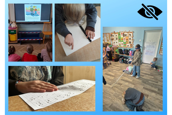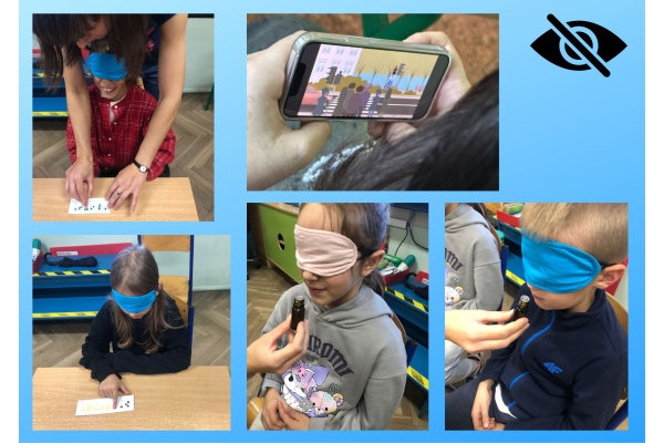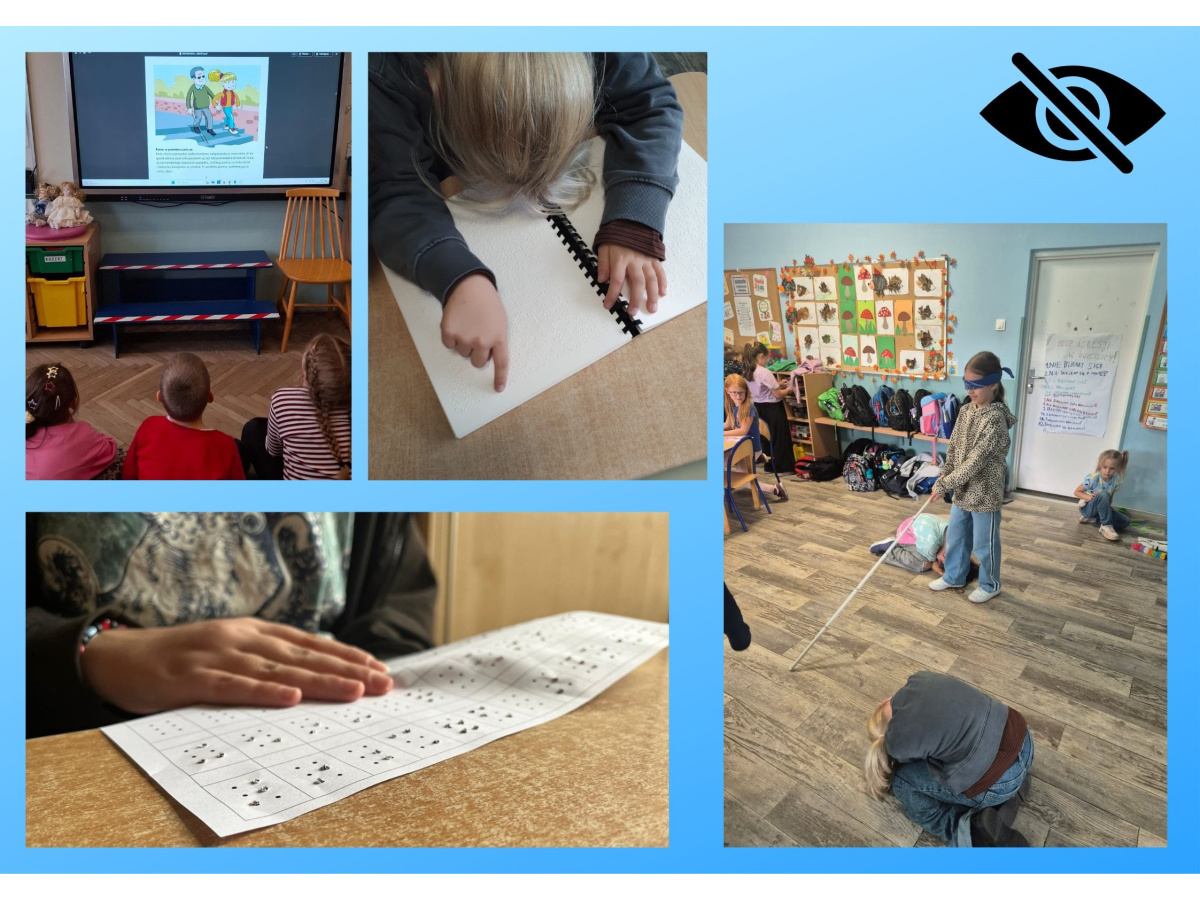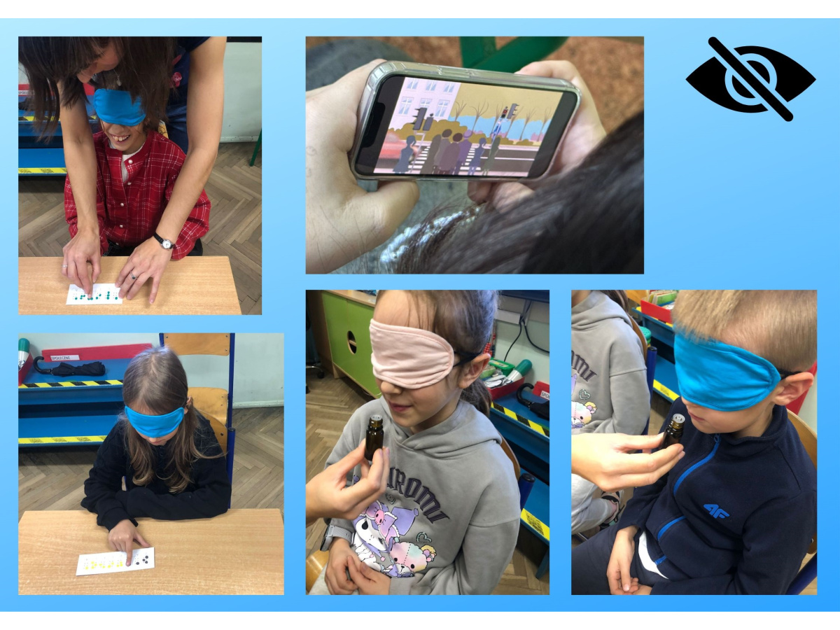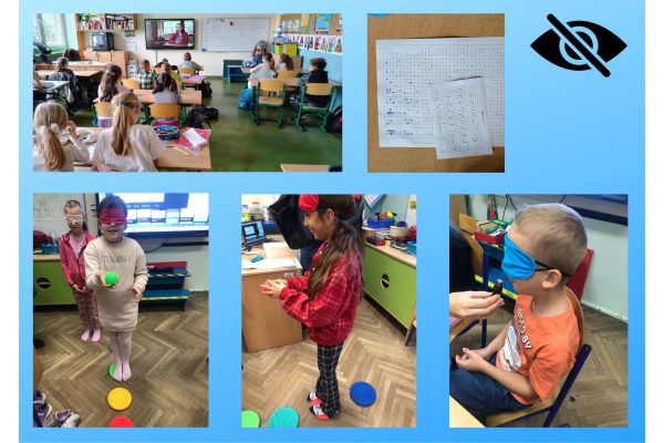 W październiku obchodziliśmy Międzynarodowy Dzień Białej Laski – wyjątkowe święto, które przypomina o codziennych wyzwaniach osób niewidomych i słabowidzących. Uczniowie w ramach zajęć edukacji wczesnoszkolnej, rewalidacji, zajęć świetlicowych i godziny wychowawczej mieli do wykonania kilka zadań, aby wczuć się w rolę osoby niewidomej- jakich trudności doświadcza, m.in.: „doświadczenie” palcem wskazującym zdań i cyfr/liczb zapisanych alfabetem Braille`a, wyklejenie plasteliną swojego imienia w alfabecie Braille`a, a następnie dotykanie paska z imieniem z zasłoniętymi oczami, próby rozpoznawania zapachów z zasłoniętymi oczami oraz rozpoznawania faktur z zasłoniętymi oczami (np. dopasowywanie piłki o określonej fakturze do właściwego krążka z identyczną fakturą), przejście odcinka drogi z zasłoniętymi oczami (uczeń prowadzony przez kolegę), podczas zajęć w świetlicy oraz godz. wychowawczej dodatkowo przejście przy pomocy białej laski, wykonanie prac przestrzennych dotyczących swoich ulubionych zwierząt.